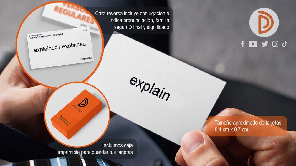 La parte reversa de cada tarjeta contiene el significado y pronunciación de cada verbo, además de estar agrupados en familias tal como verás en el video Cómo Aprender y Pronunciar los Verbos Regulares en Ingles - ED final para hacer el aprendizaje aún más fácil!